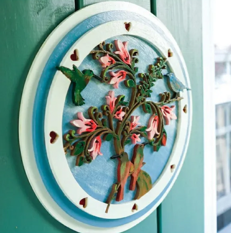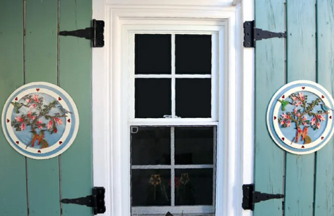 The Summer Love Plaque is shown here on exterior window shutters. l made these out of 1/4"(6mm)-thick Baltic birch plywood , then applied acrylic paint colors. I spray coated them with three layers of clear exterior-grade gloss varnish. This is a sheltered area, meaning that there is not much of an issue with rain or heavy weather, so the Baltic birch plywood works well, but where there is heavier weather , consider using cedar, pine, or even feak. These woods weather well when painted and coated with exterior-grade varnish.
