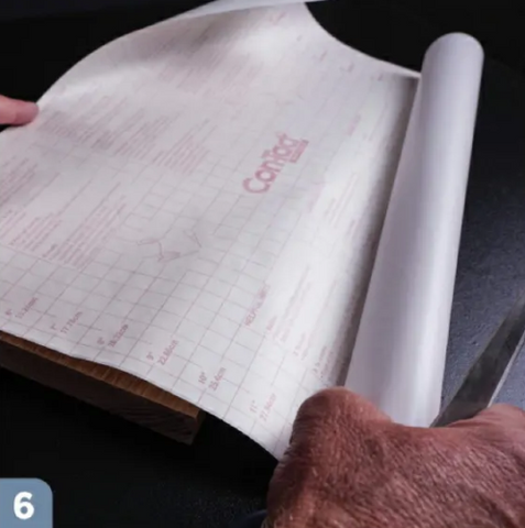 Measure and cut a piece of contact paper to the same width as the wood blank, peel the backing off the paper, and apply the sticky side to the wood.