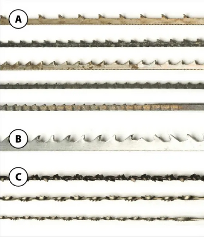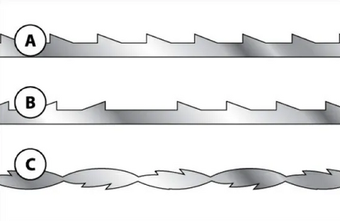 Simplified profiles of skip-tooth (A), reverse tooth(B), and spiral (C) blades