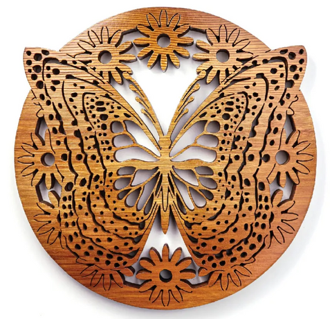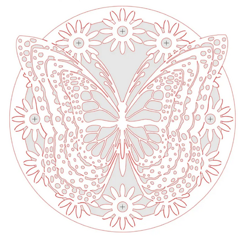 Print at actual size for 8" (20.3cm) dia. or at 125% for 10" (25.4cm) dia. Recommended wood: Baltic birch, 1/4 "-1/2"(6-13mm) thick, or any wood of choice,1/2"-3/4"(13-19mm) thick, 8 1/2'"(2l.6cm)or 10 1/2"(26.7cm) square when increasing actual size of pattern to 125% for 10"(25.4cm) dia. Recommended drill bits: 3/64"(1.2mm) & 1/16" (1.6mm) or #56 ( 1.2mm) 4(1.6mm) for interior cutouts.Flower center holes (6 places):3/8” (9.5mm) Recommended blades:#3一#5 reverse tooth for Baltic birch; #5 reverse skip-tooth or reverse tooth for hardwood;alternatively, use #0- #1 spiral Notes/special instructions: Pay special attention when cutting the butterfly antennac, as this is a fragile area to cut. Recommended finishing:For most woods, Danish oil or oil of choice; for Baltic birch plywood, acrylic paints of choice and clear protective brush-on or spray-cat finish.For exterior use, spar urethane or exterior-grade clear-coat spray. |
