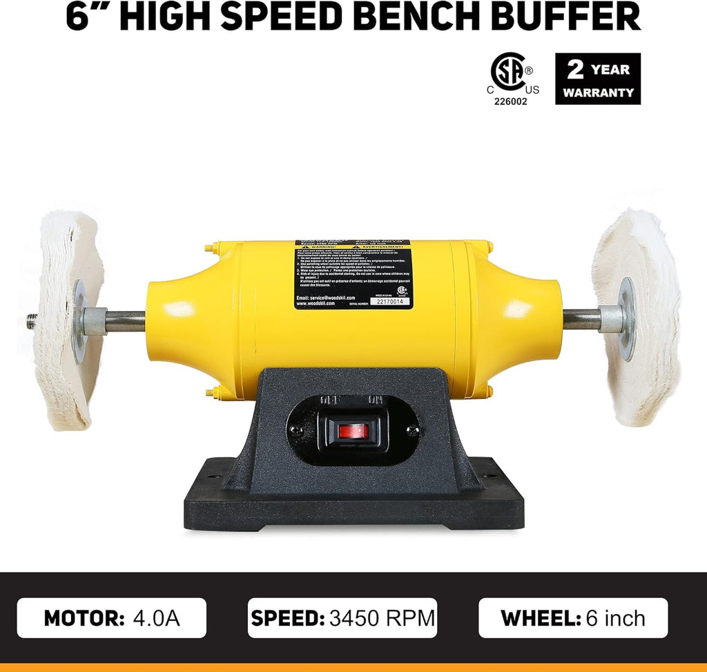 - 6" Bench Polisher: This bench buffer polisher machine features a 6 inch hard wheel for removing burrs, rust, and scratches, and a 6 inch flannelette wheel for a mirror finish. Finish jobs faster with higher precision, great for pros and DIYers alike