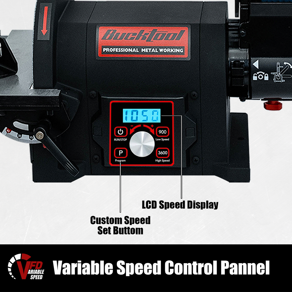 Engineered with an integrated Variable Frequency Drive (VFD), this 1 HP motor delivers unmatched power and stability. Unlike standard motors that lose power at slower speeds, our VFD technology maintains high torque even at low RPMs, ensuring consistent performance for heavy-duty sanding and grinding.