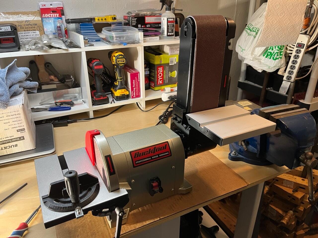 The BUCKTOOL BD4801 Bench Sander combines a 4"×36" tilting belt (0°–90°) and 8" disc in one direct-drive system (no belts), powered by a quiet 3/4 HP motor. Features an adjustable cast aluminum table, miter gauge, dual dust ports, and stable anti-vibration base for precise wood/metal sanding.