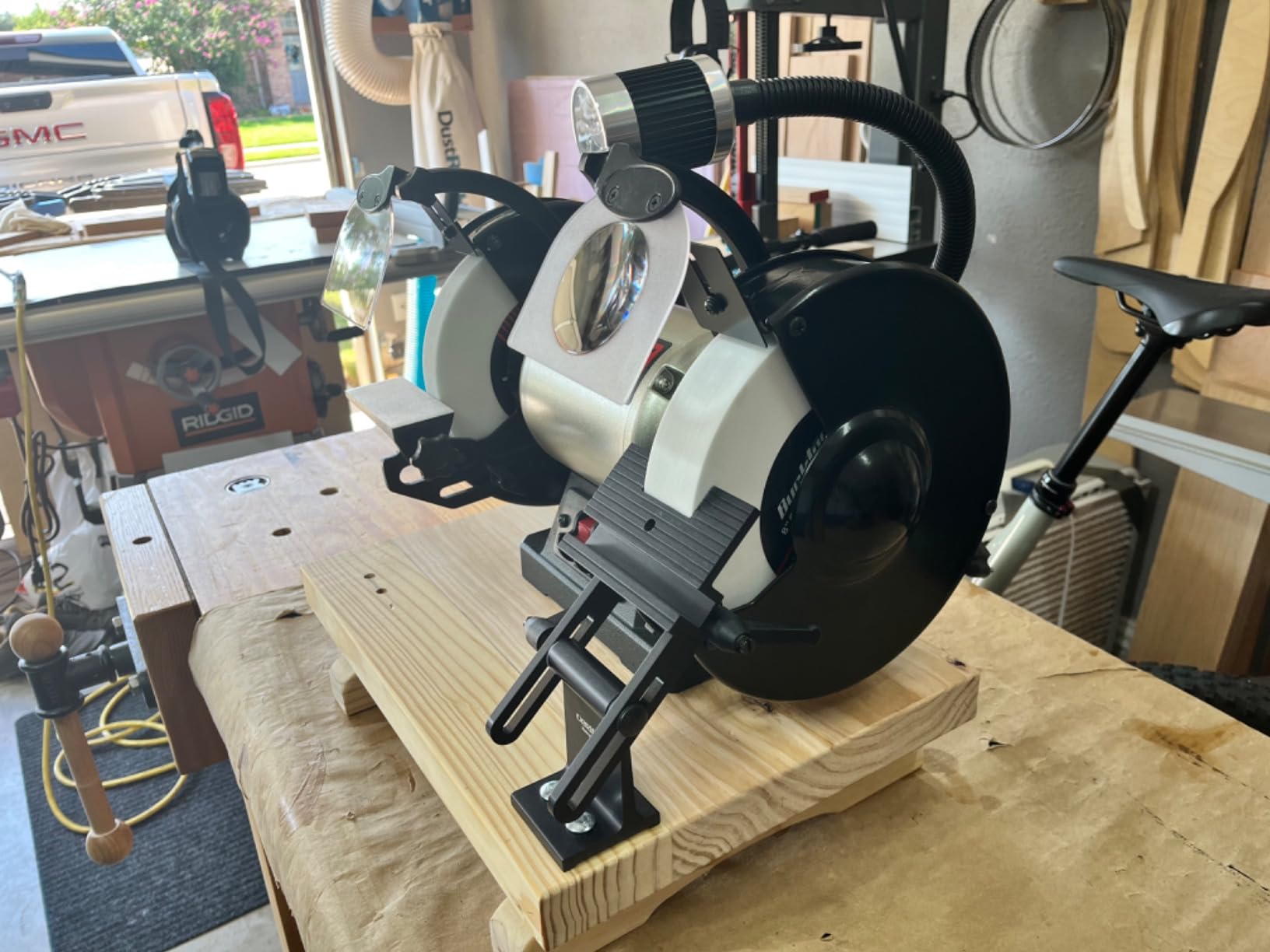 Features premium WA grinding wheels: left 8"x1"x5/8" (80 grit) and right 8"x1-1/2"x5/8" (120 grit). Works with 1-1/2" CBN wheel. Ideal for carpenters, turners, and carvers for precise, smooth sharpening.